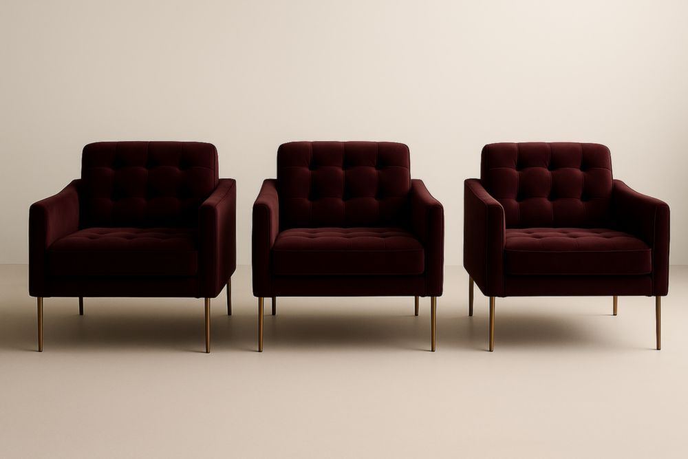 Lot de 3 fauteuils en velours marron foncé pieds en métal
