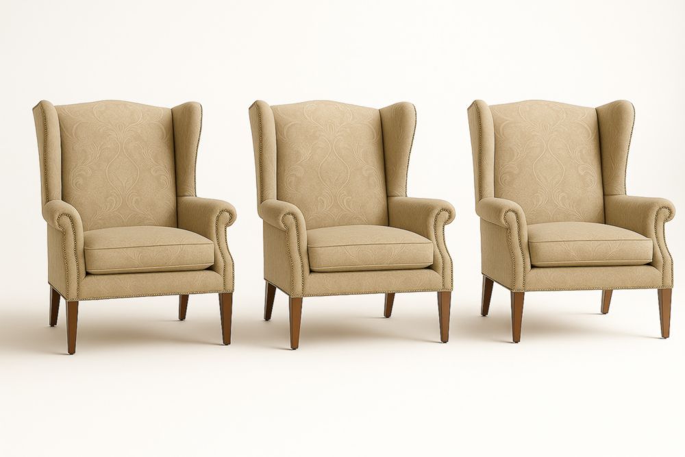 Set de 3 Fauteuils à Oreilles en Bois et Tissu Beige
